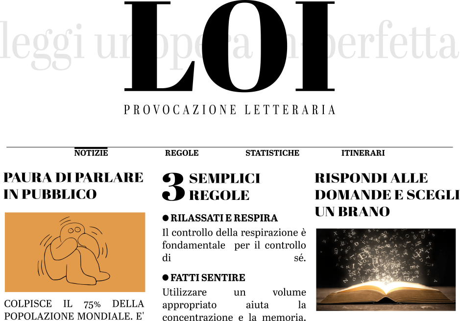 LOI è un acronimo dedicato al grande maestro Giovanni “Nanni” Loy e il cui significato è: leggi un’opera in-perfetta. Stridente e probabilmente incomprensibile come dev’essere a prima vista una provocazione. Leggere in pubblico è una delle paure più forti e diffuse; si stima che il 75% della popolazione mondiale ne sia affetta e che tale paura sia seconda solo alla paura della morte. E’ quella cosa che ti secca la gola, ti taglia il respiro e ti fa fischiare le orecchie quando sei costretto a leggere in pubblico. La sudorazione abbondante è parte dei sintomi. Leggere a prima vista un’opera con la quale si sono confrontati i grandi del nostro teatro, opere immortali e conosciute da tutti, aggiunge il disagio del confronto, del paragone.