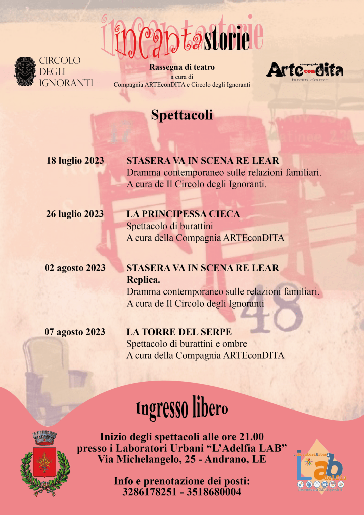 Una piccola rassegna di teatro, dedicata ai grandi e ai piccoli. A cavallo tra luglio e agosto, grazie alla disponibilità del comune di Andrano e dell’associazione Laboratori Urbani L’adelfia LAB. Gli spettacoli inizieranno alle 21.00 presso i locali di via Michelangelo 25 ad Andrano.