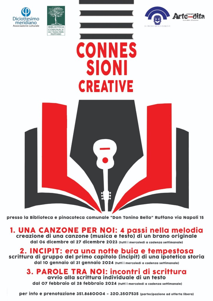 Di questo calderone culturale (che partirà a Ruffano (LE) presso e in collaborazione con la Biblioteca Comunale “Don Tonino Bello”, con l’associazione “Diciottesimomeridiano” e con l’associazione “ArteconDita” dal 06 dicembre 2023, ogni mercoledì pomeriggio alle 18, fino al 28 febbraio 2024), fanno parte: